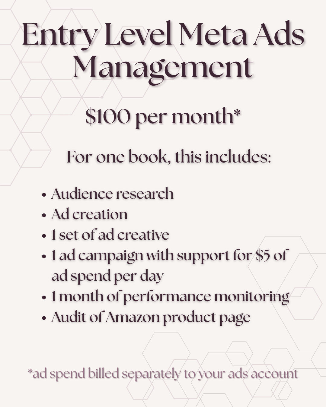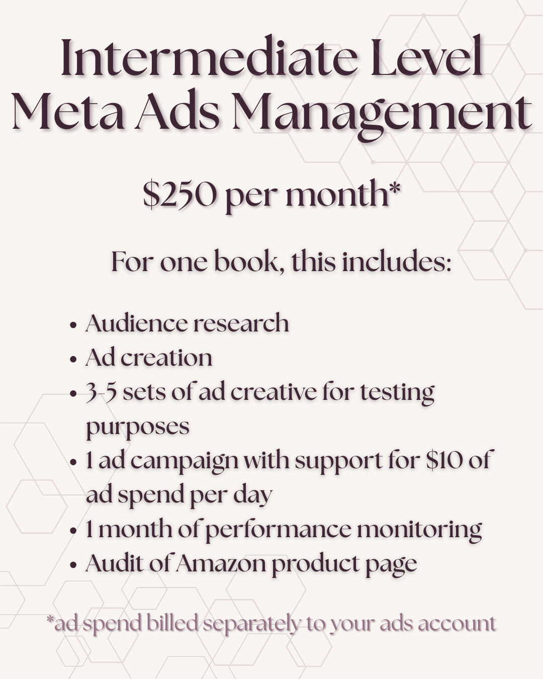 Hi there!Thank you so much for your interest in my services. I’d love to begin by introducing myself, and offering a little background about my services.I’m Madison, though I masquerade online in the book community as maybeeitsmarigold. I’ve been devouring books since before I could read, when I would coerce my parents into reading and re-reading my favorites to me every night. Even now, 30+ years since I began reading for myself, my dad hates to see a Clown-Around coming. My genre of choice originally began as whatever I could get my hands on, eventually evolving to anything with a romantic leaning, and then landing in romance, which is where I’ve been happily ensconced ever since.In reading voraciously, I’ve found that the already “discovered” books don’t even scratch the surface of the true offerings of the romance genre, and the books I’ve found for myself, through the recommendations of friends, acquaintances, or even…ads…have been the ones that resonated, that I remember, that I return to. The fact that indie authors are out here pouring their hearts, souls, and tears into amazing worlds that aren’t even reaching a fraction of their intended audience — the audience that would love their work, devour their backlists, and pop into their DMs with the words of affirmation every creative needs — is painful to me. And I know it’s painful to you, their creator, as well.I’ve been involved in the indie book community since late 2022. Initially participating in the form of ARC reading and street team posting, but growing to offer graphic and teaser creation before branching out into personal assistant services in early 2023. I’ve been lucky enough to work for some fantastic authors, companies, podcasts, and more, the majority of which have been kind enough to feed my unquenchable thirst for knowledge, while also encouraging and believing in me along the way.It was one of these authors who first introduced me to Meta ads. I had purely selfish reasons for wanting to learn. I was writing a Kindle Vella serial, and I wanted readers. She was also writing a Kindle Vella serial, and she had a growing serial readership due to Meta ads. With the crash course she provided me and a small amount of daily ad spend, I was able to consistently remain in the top 100 of Kindle Vella serials.Once Kindle Vella dissolved, I attempted to continue writing, releasing my serial episodes in volumes into Kindle Unlimited. After publishing several volumes, I resumed Meta advertising. Consistently, I was breaking even. My page reads and ebook sales paid for my ad spend, but nothing more, because I didn't have the words, the pages, the volume, to profit from it.Writing is still a part of my long-term plan. The plots and ideas and thoughts won't leave me alone, but pressuring myself into a publication timeline for my first novel is not something I'm comfortable with. Data though, that's another story...